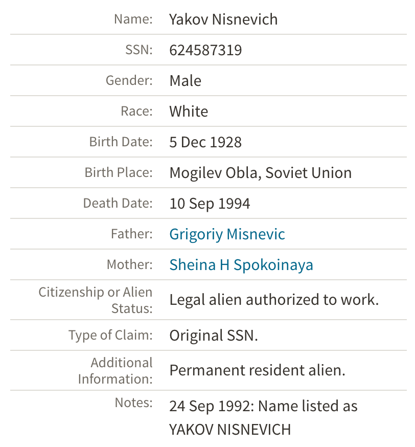 Yakov Nisnevich in the U.S., Social Security Applications and Claims Index, 1936-2007